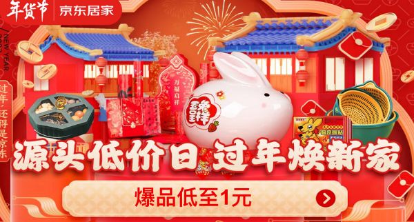 兔年春节进入倒计时,家家户户正在紧锣密鼓地置办年货。近日,京东年货节火热进行中,为了让消费者享受最高性价比的年货好物,京东居家充分发挥供应链优势,携手义乌节庆、景德镇陶瓷、南康家具、佛山瓷砖、中山灯饰、永康五金等产业带的商家,组团带来多品类产业带源头好物,满足春节居家氛围装饰、家居焕新等需求,爆款抄底价低至1元,为消费者打造实实在在的居家过年幸福感。