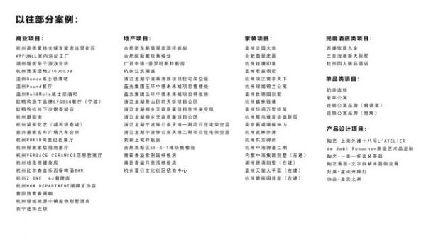 多来年服务项目的甲方有绿城、万科、融创、龙湖、朗诗、蓝光、华润 远洋、世贸、广宇、西房、德信、中天、中海、中粮、中梁、中强、中德、同人、香溢、国鸿、运河集团、IDG资本、泛城资本、 L'ATELIER de Joël Robuchon、范思哲、NIke/AJ、缸鸭狗、THULE、蘑菇街、APfunll、佩蒂股份等。