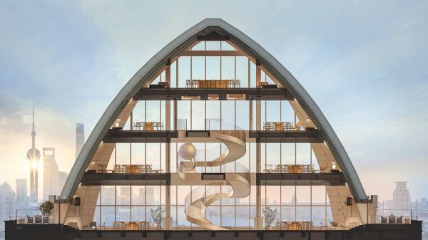 上海黄埔区海湾大厦,坐落于黄金三角北外滩,大厦建于九十年代,帝景晶采轩餐厅旗舰店位于大厦顶部楼层。原楼体塔尖顶造型结构,外轮廓宛如莲瓣,向上闭合,含苞待放。塔顶南北两侧立面原有的玻璃幕墙,为室内环境提供了通透开阔的视野,将黄埔江两岸陆家嘴、外滩景观尽收眼底。