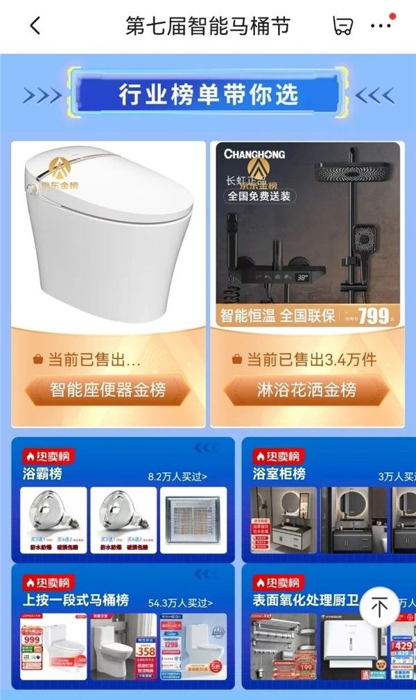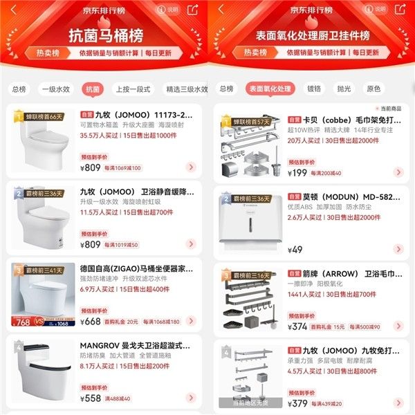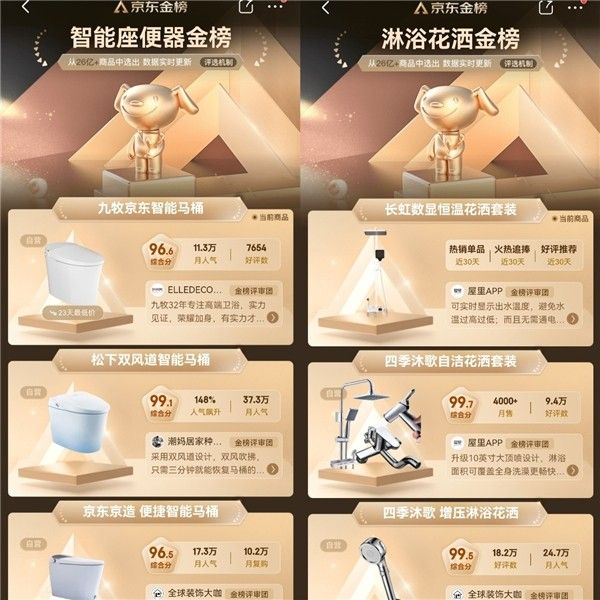 消费者在日常选购相关产品时,也可以从京东APP首页进入排行榜频道,点击“年货金榜”家居家装专区,查看厨房卫浴金榜和智能坐便器金榜的完整排名;或者在排行榜频道点击居家-厨房卫浴类目的热卖榜,查看热销单品排行,更快找到中意商品。