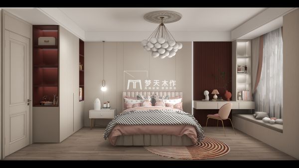他们有一位小公主,活泼,可爱,儿童房的设计采用主色珊瑚灰所呈现的暖色,搭配胭脂红的跳色,悬挂抽屉柜书桌,衣柜搭配开放格,让整个儿童房温馨的同时不失灵动性。整个房子温馨,浪漫,满足对家的一切想象!