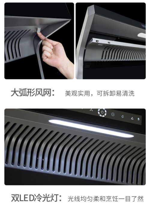 配合机身顶部的柔光LED灯照明,白光亮光柔和,光源充足,为你带来舒适开阔的烹饪视野,菜色清晰可见;可视化大容量油杯,储油情况一目了然,方便及时清理;折面隐藏式油网,外观美观大方,增强用户体验感。