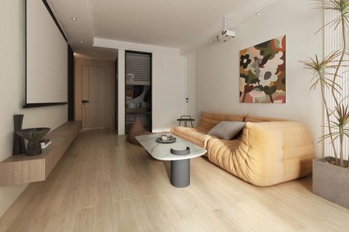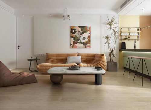 客厅通铺木纹砖,彰显出整体简约、干净的基调,营造视觉延伸感。橙黄色的沙发和个性的挂画,既与地面的木纹砖形成了统一,又以高饱和度的色彩为空间增添活力和生机。摒弃了传统的电视背景墙设计,采用投影仪打造家庭影音室,足不出户就可以享受到影院般的观影体验,成为高品质生活的标志。