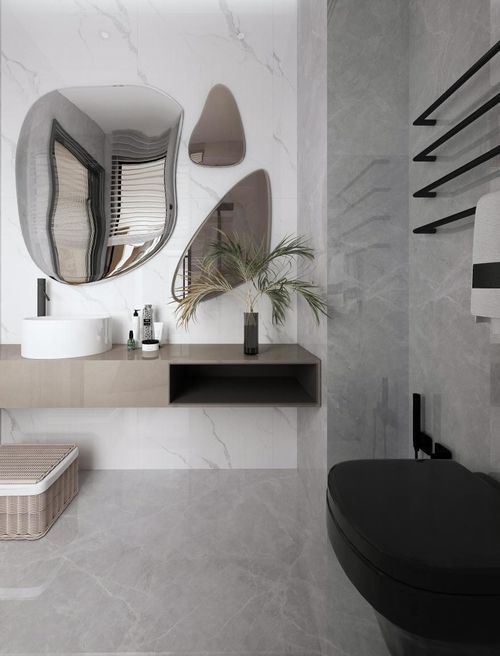 卫生间采用深浅不一的灰色瓷砖,搭配原木色的洗漱桌和造型别致的镜子,符合整体空间格调,简洁大气又不失品质感。以黑色马桶和黑色金属元素为点缀,高级又充满时尚感。
