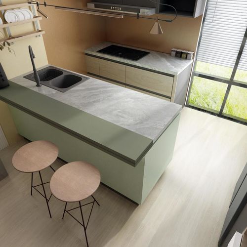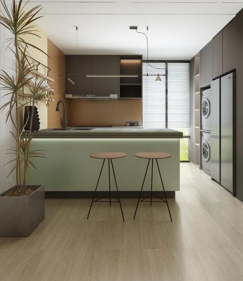 餐厨一体化的设计,灵活运用高性能岩板为岛台与餐桌,实用性强,提高空间利用率。暖色调的木纹砖与绿色岛台、黄色墙面相互搭配,层次递进的色彩质感为空间带来了更多艺术感,体现了餐厨区域的优雅与精致,恰到好处地展现家的温馨和舒适。