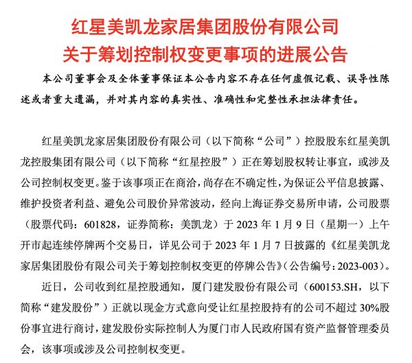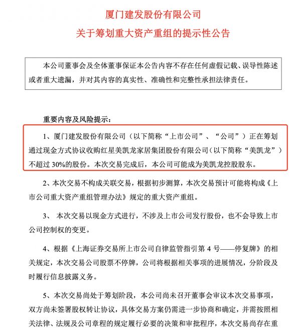 同时,股权受让方——红星美凯龙也于当晚发布了相关公告称,红星控股正就以现金方式意向受让红星控股持有的公司不超过30%股份事宜进行商讨,并指出,建发股份实际控制人为厦门市人民政府国有资产监督管理委员会,该事项或涉及公司控制权变更。