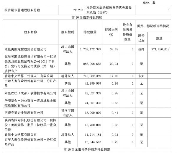 截至2022年12月31日,美凯龙总股本4,354,732,673股,包括A股3,613,447,039股(占总股本比例82.98%)及H股741,285,634股(占总股本比例17.02%)。红星控股直接持有美凯龙2,618,081,007股股份,占总股本的60.12%,其中在境内非国有法人39.78%的股份中,有971,786,018股股票处于质押状态,另外20.34%的股份则为红星美凯龙控股集团有限公司2019年非公开发行可交换公司债券(第一期)质押专户所有。
