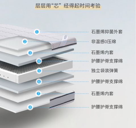 在材质上,朗怡0压厚垫内外套均采用了石墨烯材质的面料,可以对细菌细胞膜的插入进行切割,破坏细胞膜以达到抑菌效果,加上填充部分记忆绵本身开放性的细胞结构,能够有效抑制细菌的入侵和生长,起到双重抑菌的作用。床垫内部采用了独立袋装弹簧,相当于床垫每个区域都是独立支撑互不干扰,带有很强的静音和抗干扰性,无论睡姿如何变化,都不会打扰到枕边人。