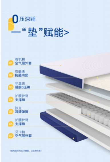 在材质上,快充床垫的外套采用了有机棉面料,这种面料通常是作为婴幼儿服饰使用,更为亲肤健康,没有化学残留,不易诱发过敏、气螨等皮肤问题。内套与朗怡一致,添加有石墨烯抗菌分子,有效抑制细菌生长。填充层采用的是梦百合自家专利的0压绵,利用其慢回弹的特点可以适应不同的身形和睡姿。相比朗怡,快充所用0压绵不仅做了加厚处理,使其更贴合,舒适度更高,里面还额外添加有气感凝胶分子,带来良好的散热性和透气性,恒温舒适,确保消费者在睡眠的过程中,不会出现闷热出汗等现象,保证了睡眠质量和深睡时长,让睡眠舒适度更上一层。