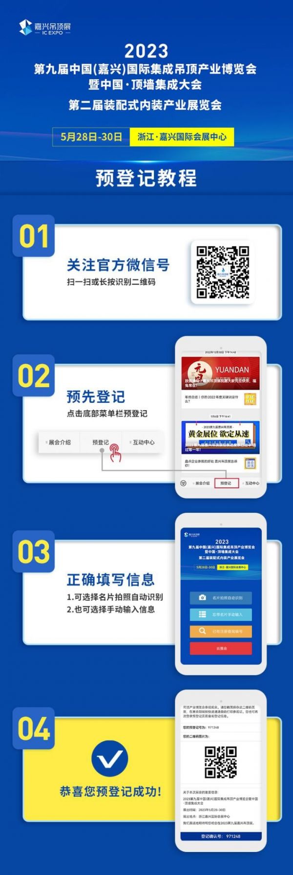 随着开展时间越来越近,本届嘉兴吊顶展观众预登记通道现已正式开启,请您阅读预登记攻略,观展快人一步,获得先机!