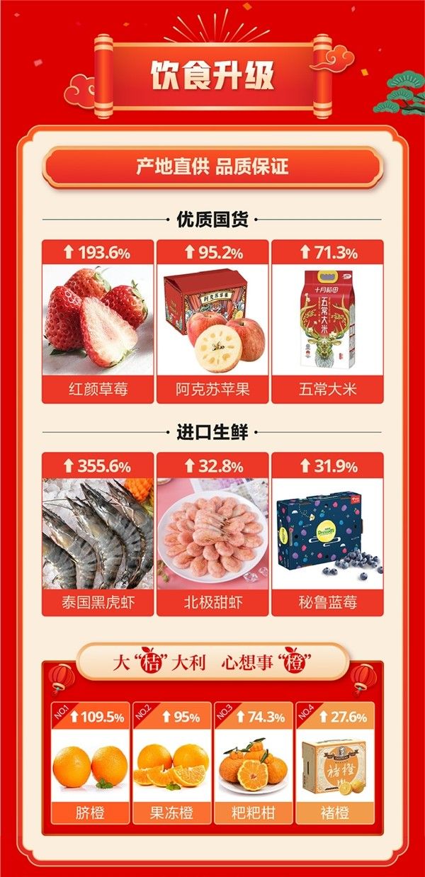 《年货趋势报告》显示,今年年货节期间,本土优质食品迎来一波消费高峰。其中,红颜草莓GMV同比增长193.6%,阿克苏苹果GMV同比增长95.2%,五常大米GMV同比增长71.3%。张宇昂分析,这也从侧面反映了消费者对于食品需求从吃饱转为吃好,生态环保、品质优良、味道独特的“土特产”,成为人们消费升级后的“心头好”。值得关注的是,春节期间人们购物不仅是为了吃,也求个好彩头,因此有“大吉大利”、“心想事成”谐音梗的柑橘类水果也迎来大卖,“目前,平台脐橙、果冻橙、粑粑柑成为柑橘水果GMV增幅TOP3商品。”张宇昂说道。