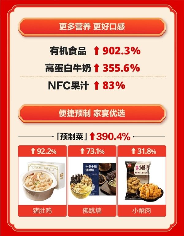相比传统春节饮食,今年消费者对于“春节吃什么”的诉求更多元,不仅追求口味的多样性,带火了各地农产品,在健康层面也有了更高标准,有机食品、高蛋白牛奶受到市场追捧。除此之外,产品品质和操作便捷也成了新的需求增长点,原产地直供和预制菜销量一路走俏。