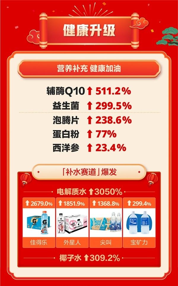 今年年货消费选择中的一大特点,是大家对“健康”的追求显著增长。《年货趋势报告》显示,以保健品、体检、健康功能家电为代表的“健康年货”成为今年人们年货消费的亮点。