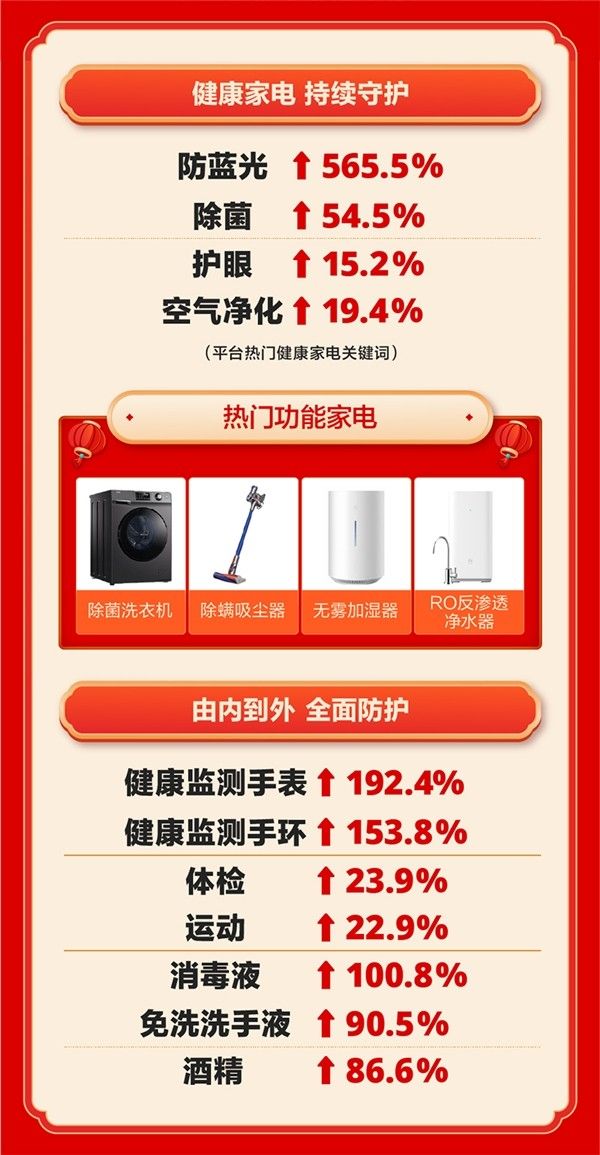 除了对保健品的追捧外,消费者对于健康的追求还体现在家居环境健康,对于具备除菌、消毒、空气净化等功能的健康家电需求持续增长。年货节期间,平台“防蓝光”、“除菌”、“空气净化”等健康功能关键词商品GMV分别同比增长65.5%、54.5%和19.4%,其中除菌洗衣机、除螨吸尘器、无雾加湿器、RO反渗透净水器则成为相应品类的销量TOP级产品,充分印证了消费者对于健康品质生活的“进阶”需求。张宇昂认为,“健康”是家电产业确定的发展趋势,甚至在未来会成为标配功能,因此产品研发能力和对于用户需求的反应能力,会成为未来行业竞争的关键。