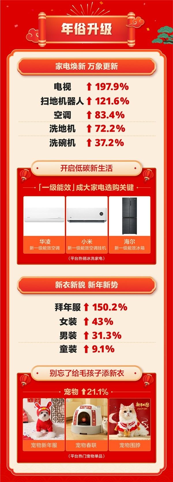 新年新面貌,年货节期间,不少人集中采购“新年战袍”。平台拜年服GMV同比增长150.2%,女装、男装GMV分别同比增长43.0%、31.3%,成为不容忽视的数据增长亮点,彩妆、香水、护肤品等感性消费亦回升,整体体现出了感性消费品的快速回暖,也意味着用户消费信心和消费潜力正逐步释放。
