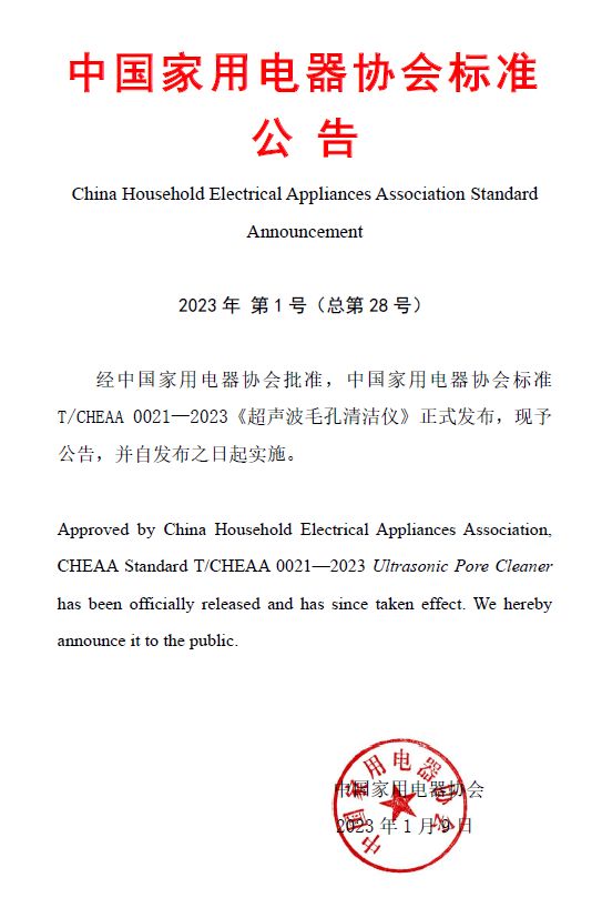 经中国家用电器协会批准,中国家用电器协会标准T/CHEAA 0021—2023《超声波毛孔清洁仪》正式发布,现予公告,并自发布之日起实施。