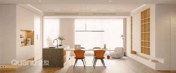 现在的年轻人大多没有看电视的需求,除了将电视柜改造为整墙储物柜以外,还可以把“沙发+茶几”的组合改为“岛台+长桌”。这样设计不仅可以满足烘焙的乐趣,偶有社交需求也不用担心没有待客的地方,喜欢品茗的人,还可以将长桌作为茶桌使用,客厅功能更加多元,实用性更强。