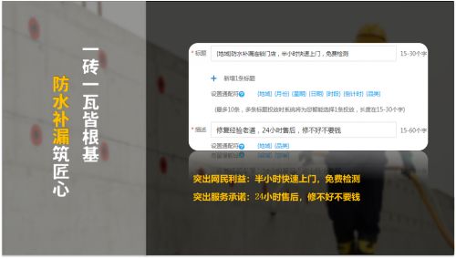 长期以来,国内防水行业集中度较低、市场较为分散,呈现“大行业、小企业”现象。面对良莠不齐的状况,雨昂依托一站式服务能力,突破价格优势,在落地页上进行“免费上门”、“十年质保”的承诺,结合人性,突出服务与售后水平。用靠谱有质量的施工让消费者放心,用透明有保障的服务让消费者省心。