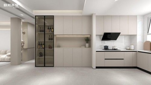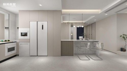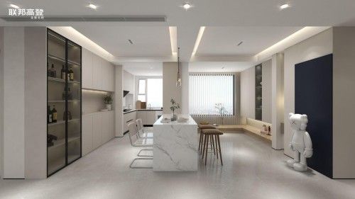 厨房为U型开放布局,打造交互动线灵活自在;现代吧台将餐厨与休闲地巧妙分区,轻松解锁多功能实用空间。