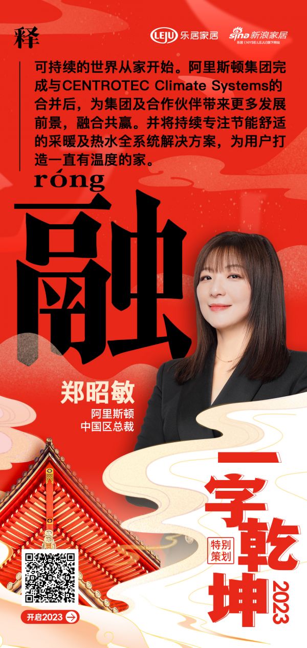 在“2023 一字乾坤”活动中,阿里斯顿中国区总裁 郑昭敏用「融」字表达了2023年的规划策略及目标:可持续的世界从家开始。2023年,阿里斯顿将持续推动品牌理念,完善高效、节能的全系统解决方案,为用户提供更舒适卓越的体验。阿里斯顿集团也将因完成与CENTROTEC Climate Systems的合并,为集团及合作伙伴带来更多的发展前景,融合共赢。未来我们将携手合作伙伴把卓越的解决方案和服务融入到千家万户,为用户打造“一直有温度的家”。