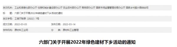 2022年3月14日,工业和信息化部、住房城乡建设部、农业农村部、商务部、国家市场监督管理总局、国家乡村振兴局六部门联合倡导下的《关于开展2022年绿色建材下乡活动的通知》正式发布,确定将于今年3~12月联合开展主题为“绿色建材进万家 美好生活共创建”的绿色建材下乡活动。