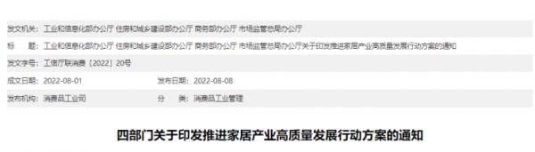 2022年8月1日,工业和信息化部、住房和城乡建设部、商务部、市场监管总局等四部门联合编制了《推进家居产业高质量发展行动方案》,方案明确发展目标,到2025年,在家用电器、照明电器等行业培育制造业创新中心、数字化转型促进中心等创新平台;重点行业两化融合水平达到65%,培育一批5G全连接工厂、智能制造示范工厂和优秀应用场景;