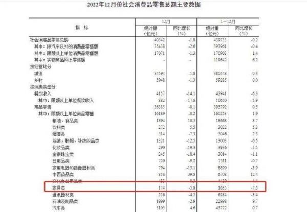 2023年1月17日,国家统计局发布了2022年社会消费品零售总主要数据,数据显示,2022年,社会消费品零售总额439733亿元,比上年下降0.2%;其中,家具类消费品零售额1635亿元,同比下降7.5%。2022年12月份,社会消费品零售总额40542亿元,同比下降1.8%;其中,家具类的消费品零售额174亿元,同比下降5.8%。