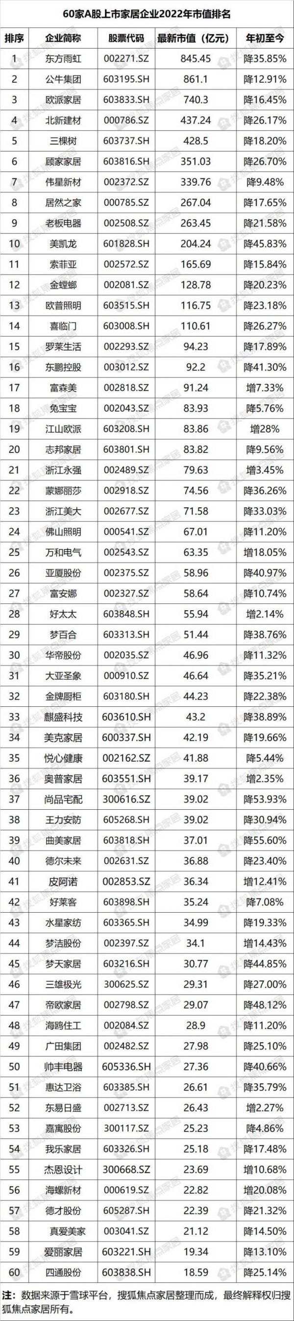 60家A股上市家居企业2022市值: