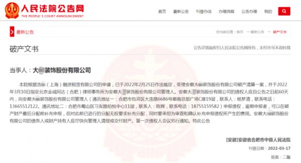 拖欠款数额较大的装企,大多与金融借款、民间借贷、建设工程施工合同纠纷有关,这其中不乏有一些曾具有一定实力的装企。比如,安徽大*装饰股份有限公司在新三板上市,其注册资本1.53亿元。据该公司于2022年12月21日发布的《关于公司股票可能被终止挂牌的进展公告》,安徽省合肥市中级人民法院于2022年2月25日裁定受理浩瀚(上海)融资租赁有限公司申请安徽大*装饰股份有限公司破产清算一案,公司存在被终止挂牌的风险。