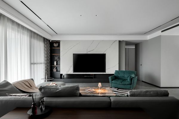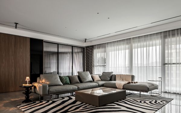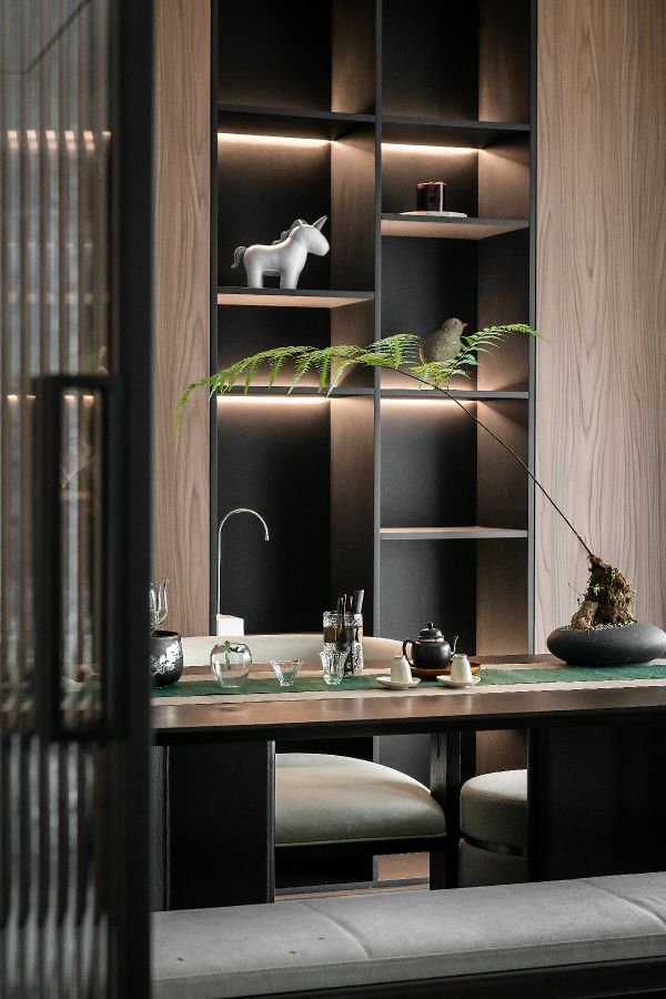 【吴昌毅】:以项目《九曲河》为例,本案运用富有精致感的装饰设计,还原一场关于家的时尚美学盛宴,深色木质材质与黑色金属、玻璃、大理石的搭配,灰色墙面乳胶漆的搭配,简约且利落。茶室镂空的装饰柜迎接主人的早出晚归,大理石与玻璃,黑色金属,木质的有机融合,局部的射灯点缀照耀空间光感,构建出一屋温暖和精致奥义,举杯交错间,一日三餐便在此进行。哑光皮沙发与绿色单椅让身处其中的家人能放松休闲。