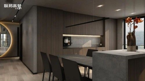 与墙同宽的挑高餐边收纳柜,配色纹理坚守着冷峻理性,让绅士格调尽显;同时利用回字型设计将存储值拉满,为日常收纳轻松减压。