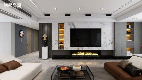 电视背景墙讲究明快线条的中性搭配,久看仍不觉腻;一侧的多功能储物柜,别致设计赏心悦目,点缀空间的同时展现独特个性。黑色地台搭配动感火焰装饰,为家带来了无限跃动生趣。
