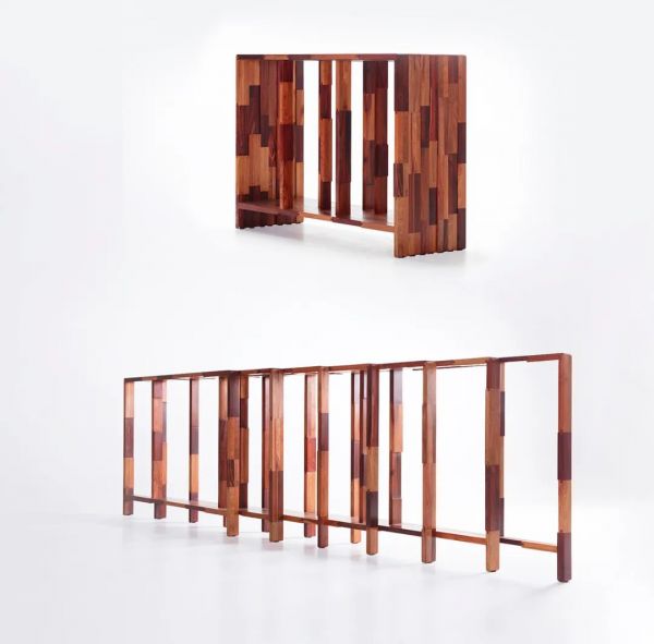 (作品“来来往往”系列虽是红木条案和屏风,却是用家具厂废料堆里挑选出来的红木边角料,用榫卯的做法拼合而成。)