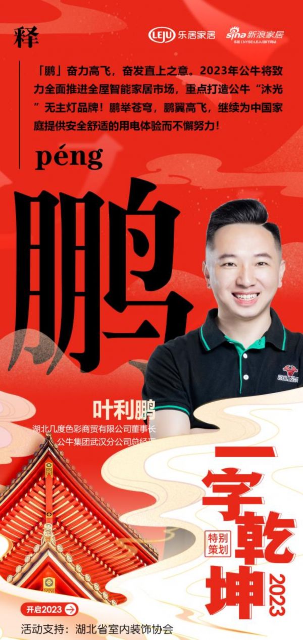 在新浪家居“2023一字乾坤”活动中,湖北几度色彩商贸有限公司董事长、公牛集团武汉分公司总经理叶利鹏:「鹏」奋力高飞,奋发直上之意。2023年公牛将致力全面推进全屋智能家居市场,重点打造公牛“沐光”无主灯品牌!鹏举苍穹,鹏翼高飞,继续为中国家庭提供安全舒适的用电体验而不懈努力!