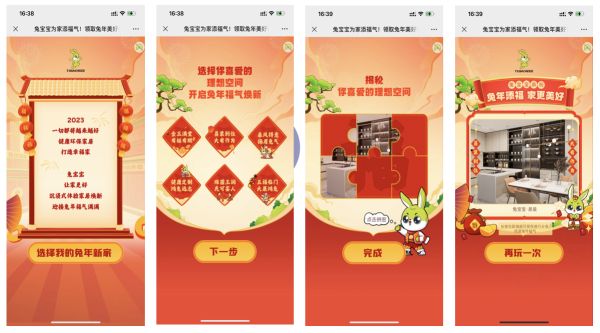 另一方面,兔宝宝在微博等社交平台顺势开启#找兔宝宝,为家添福气#的话题场域,通过互动H5,将兔宝宝家居产品与家居“福气焕新”相结合,一面渗透话题,加深消费者对“兔宝宝,让家更好”品牌理念的感知;一面激发种草购买力,有效缩短了用户的选购流程。