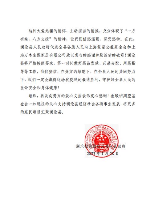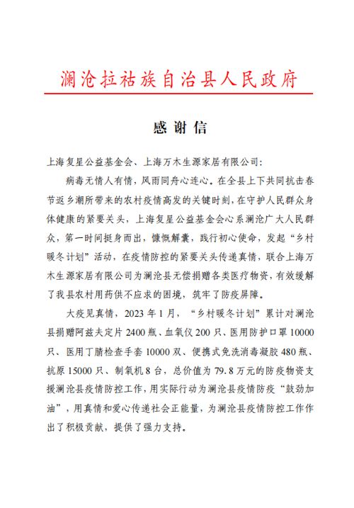 在传递善意的道路上,点滴付出亦会被看见。澜沧县政府发来感谢信,信中表达了对源氏木语和复兴基金会,关键时刻挺身而出,疫情防控紧要关头捐赠医疗用品的衷心感谢!