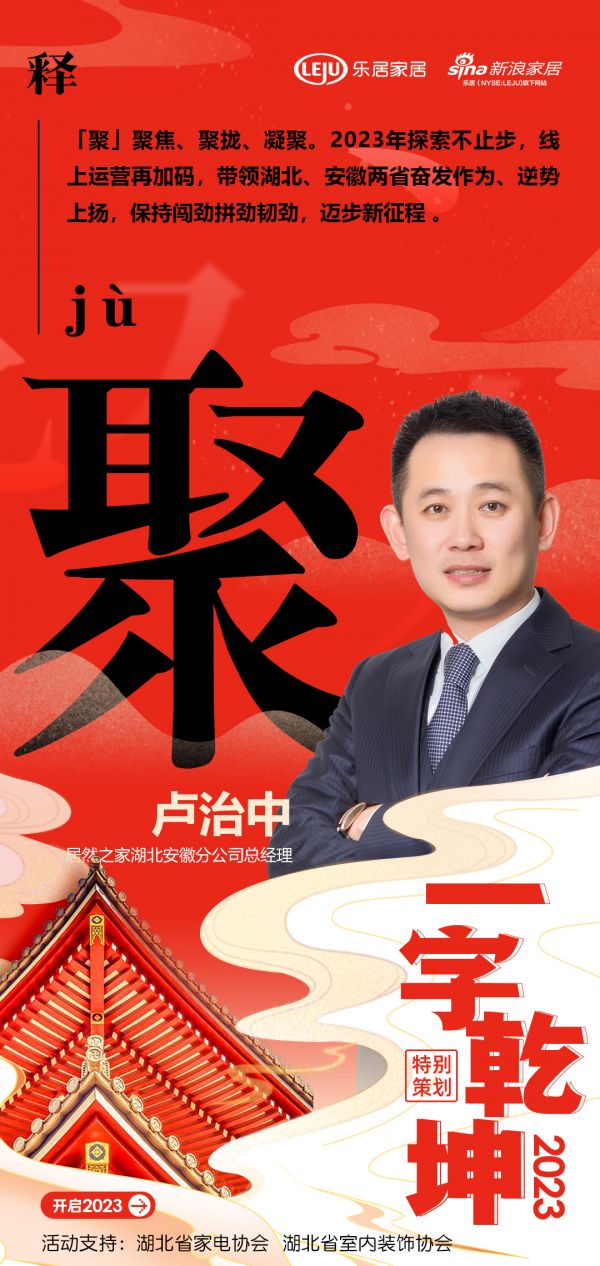 在新浪家居“2023一字乾坤”活动中,居然之家湖北安徽分公司总经理卢治中:「聚」聚焦、聚拢、凝聚。2023年探索不止步,线上运营再加码,带领湖北、安徽两省奋发作为、逆势上扬,保持闯劲拼劲韧劲,迈步新征程 。