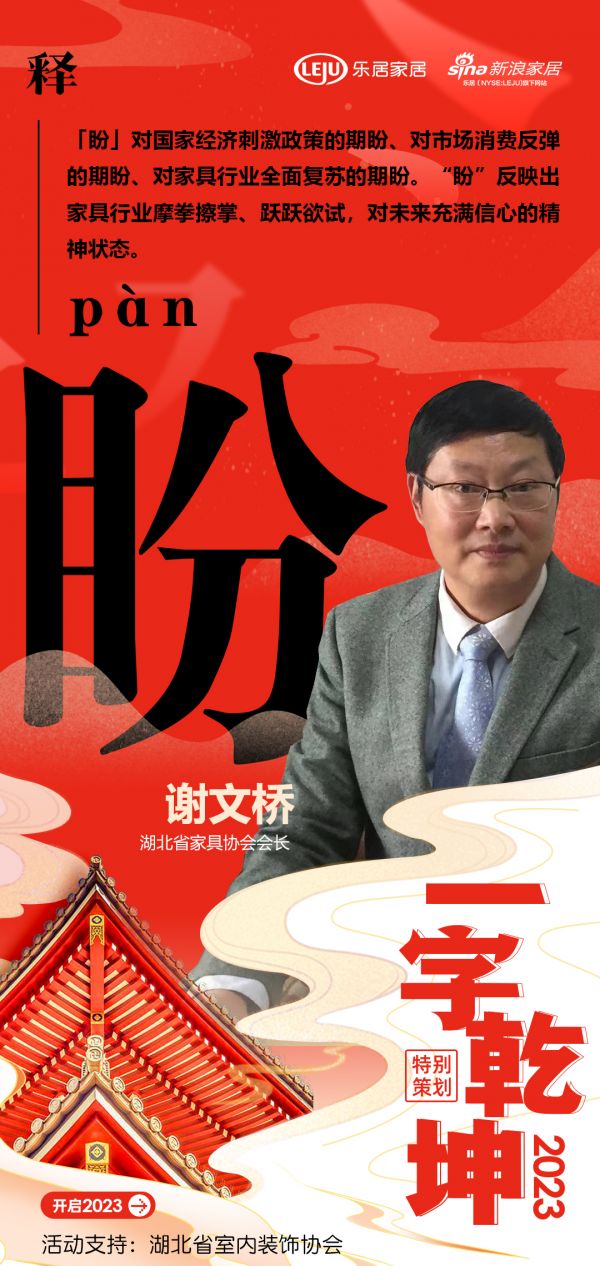 在新浪家居“2023一字乾坤”活动中,湖北省家具协会会长谢文桥:「盼」对国家经济刺激政策的期盼、对市场消费反弹的期盼、对家具行业全面复苏的期盼。“盼”反映出家具行业摩拳擦掌、跃跃欲试,对未来充满信心的精神状态。
