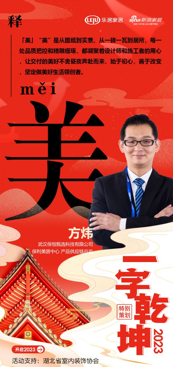 在新浪家居“2023一字乾坤”活动中,武汉保恒甄选科技有限公司保利美居中心产品供应链总监方炜:「美」“美”是从图纸到实景、从一砖一瓦到居所,每一处品质把控和精雕细琢,都凝聚着设计师和施工者的用心,让交付的美好不舍昼夜奔赴而来,始于初心,善于改变,坚定做美好生活领创者。