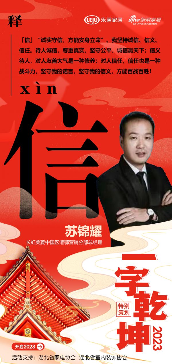 在新浪家居“2023一字乾坤”活动中,长虹美菱中国区湘鄂营销分部总经理苏锦耀:「信」“诚实守信,方能安身立命”。我坚持诚信、信义、信任。待人诚信,尊重真实,坚守公平,诚信赢天下;信义待人,对人友善大气是一种修养;对人信任,信任也是一种战斗力,坚守我的诺言,坚守我的信义,方能百战百胜!