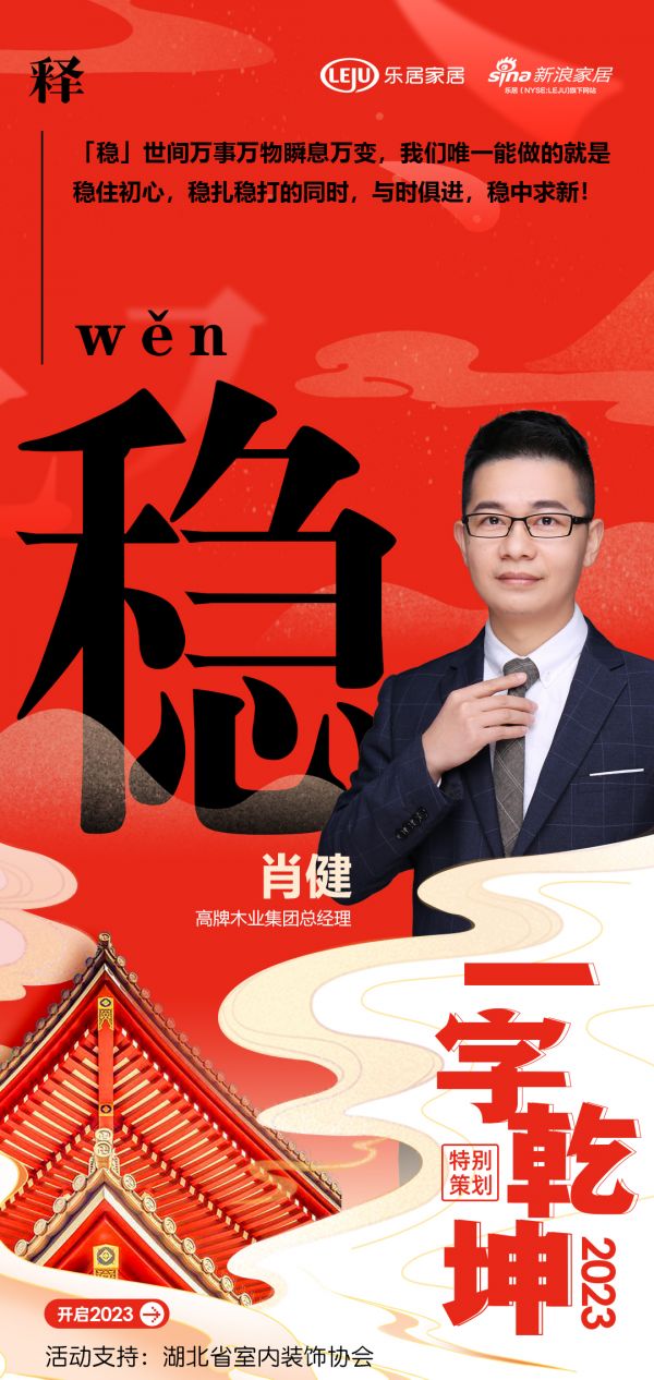 在新浪家居“2023一字乾坤”活动中,高牌木业集团总经理肖健:「稳」世间万事万物瞬息万变,我们唯一能做的就是稳住初心,稳扎稳打的同时,与时俱进,稳中求新!