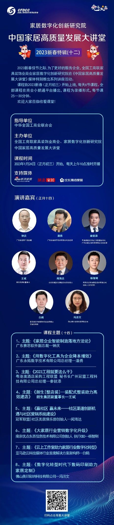值此新春佳节之际,由全国工商联家具装饰业商会家居数字化创新研究院主办的2023“中国家居高质量发展大讲堂”于正月初三上午10点正式上线播出!《中国家居高质量发展大讲堂》自2022年春节推出以来,深受行业的好评,最多时一场十几万人在线收看。