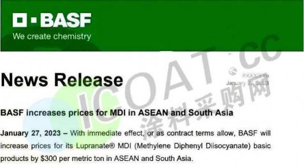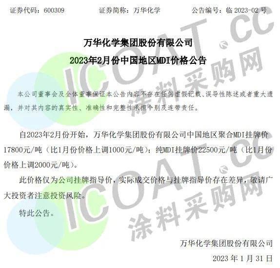 近日,万华化学发布公告,自2023年2月份开始,公司中国地区聚合MDI挂牌价17800元/吨 (比1月份价格上调1000元/吨); 纯MDI挂牌价22500元/吨 (比1月份价格上调2000元/吨)。