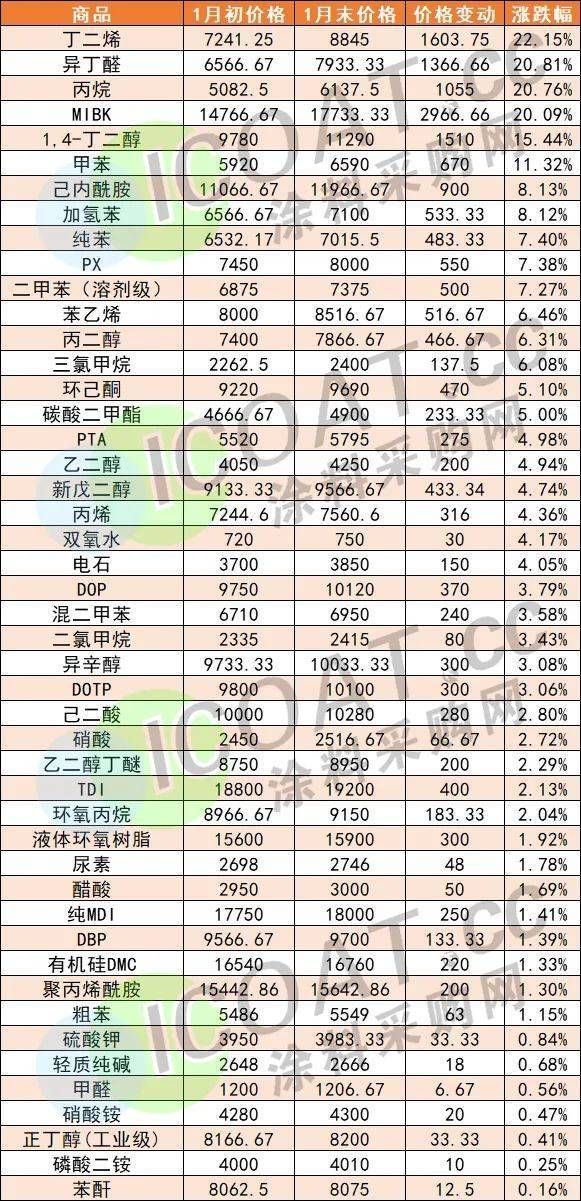 2023年1月部分化工品涨价榜