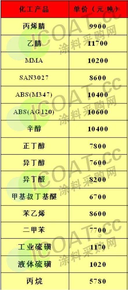 利华益集团报价表显示,与年初价格相比,丙烯腈上涨400元/吨,MMA上涨100元/吨,辛醇上涨900元/吨,异丁醇上涨200元/吨,异丁醛上涨200元/吨,甲基叔丁基醚上涨100元/吨,苯乙烯上涨500元/吨,丙烷上涨780元/吨。