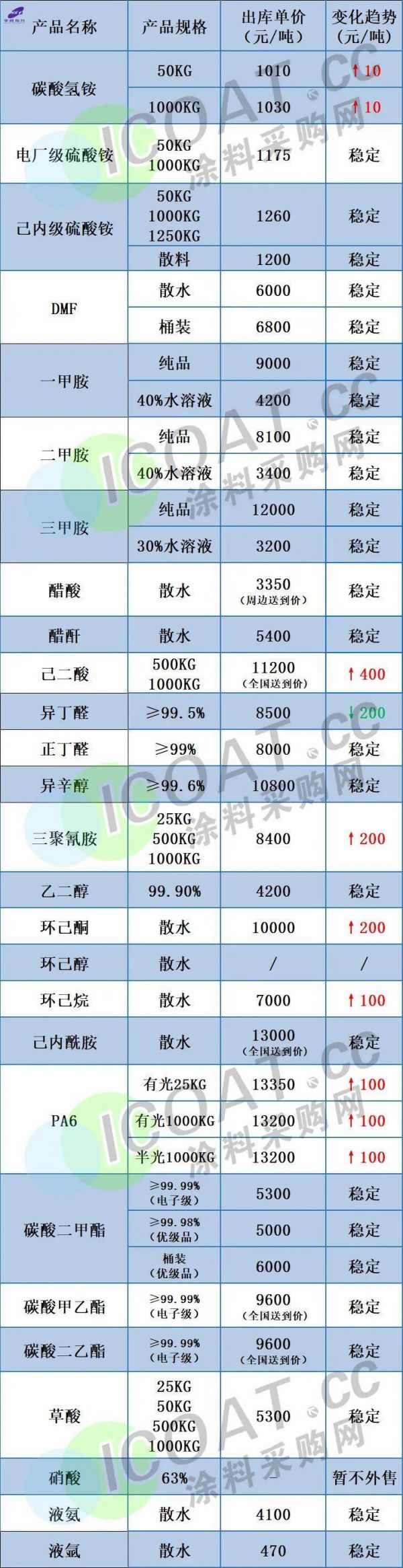 华鲁恒升报价表显示,与年初价格相比,碳酸氢铵上涨10元/吨,醋酸(散水送到)上涨250元/吨,醋酐上涨100元/吨,己二酸(全国送到价)上涨1000元/吨,异辛醇上涨1200元/吨,三聚氰胺上涨300元/吨,乙二醇上涨100元/吨,环己酮上涨1100元/吨,环己烷上涨400元/吨,PA6上涨1350元/吨,碳酸二甲酯上涨300元/吨。