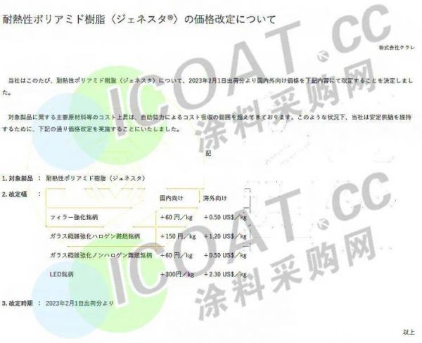可乐丽株式会社发布调价通知,自2023年2月1日起,填料强化品种和玻璃纤维强化卤素阻燃品种国内涨60日元/kg,国外市场涨0.5美元/kg(约合人民币3392元/吨);玻璃纤维强化卤素阻燃品种国内涨150日元/kg,国外市场涨1.2美元/kg(约合人民币8184元/吨);LED品种国内涨300日元/kg,国外市场涨2.3美元/kg(约合人民币15604元/吨)。