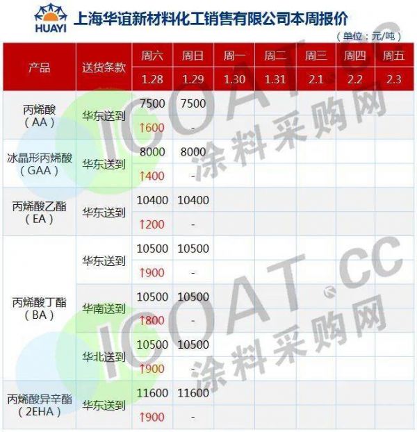 上海华谊新材料价格表显示,与年初价格相比,丙烯酸上涨600元/吨,冰晶形丙烯酸上涨400元/吨,丙烯酸乙酯上涨200元/吨,丙烯酸丁酯上涨900元/吨,丙烯酸异丁酯上涨900元/吨。
