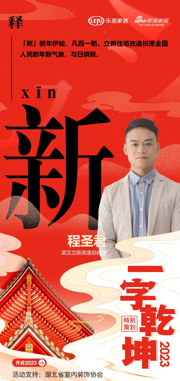 在新浪家居“2023一字乾坤”活动中,武汉立新改造总经理程圣君:「新」新年伊始,凡百一新。立新住宅改造祝愿全国人民新年新气象,与日俱新。