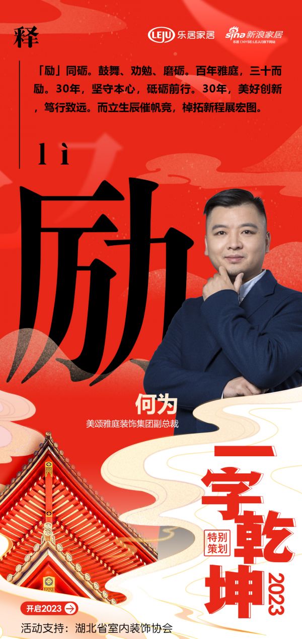 在新浪家居“2023一字乾坤”活动中,美颂雅庭装饰集团副总裁何为:「励」同砺。鼓舞、劝勉、磨砺。百年雅庭,三十而励。30年,坚守本心,砥砺前行。30年,美好创新,笃行致远。而立生辰催帆竞,棹拓新程展宏图。